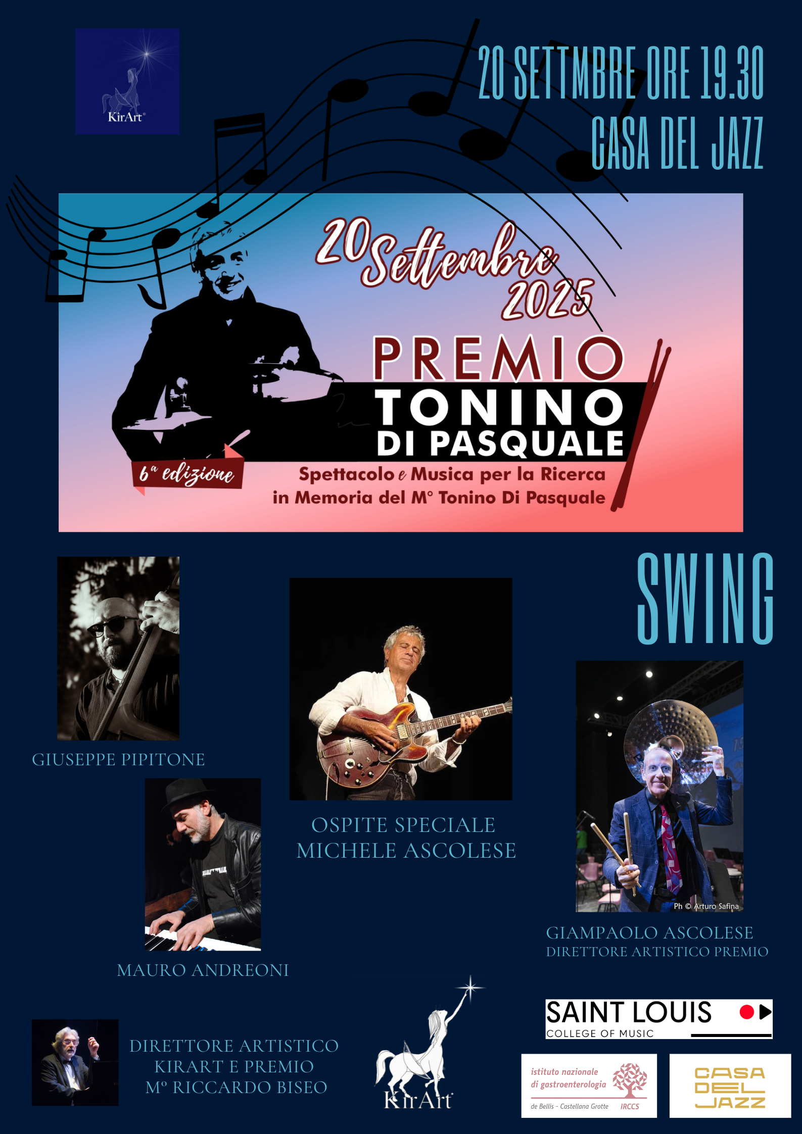 L’Associazione Culturale KirArt, presieduta dall’Avv. Maria Bonfiglio, organizza la sesta edizione del “Premio Tonino Di Pasquale”, dedicato al Maestro scomparso il 12 gennaio 2020.La serata finale si terrà il 20 settembre 2025 ore 19:30 presso la Casa del Jazz – Villa Osio, Roma. Il concorso, rivolto a giovani tra i 10 e i 35 anni, […]